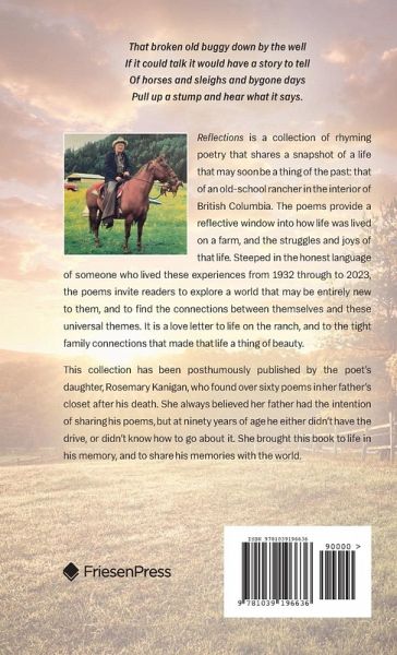 That broken old buggy down by the well If it could talk it would have a story to tell Of horses and sleighs and bygone days Pull up a stump and hear what it says. Reflections is a collection of rhyming poetry that shares a snapshot of a life that may soon be a thing of the past: that of an old-school rancher in the interior of British Columbia. The poems provide a reflective window into how life was lived on a farm, and the struggles and joys of that life. Steeped in the honest language of someone who lived these experiences from 1932 through to 2023, the poems invite readers to explore a world that may be entirely new to them, and to find the connections between themselves and these universal themes. It is a love letter to life on the ranch, and to the tight family connections that made that life a thing of beauty. This collection has been posthumously published by the poet's daughter, Rosemary Kanigan, who found over sixty poems in her father's closet after his death. She always believed her father had the intention of sharing his poems, but at ninety years of age he either didn't have the drive, or didn't know how to go about it. She brought this book to life in his memory, and to share his memories with the world.