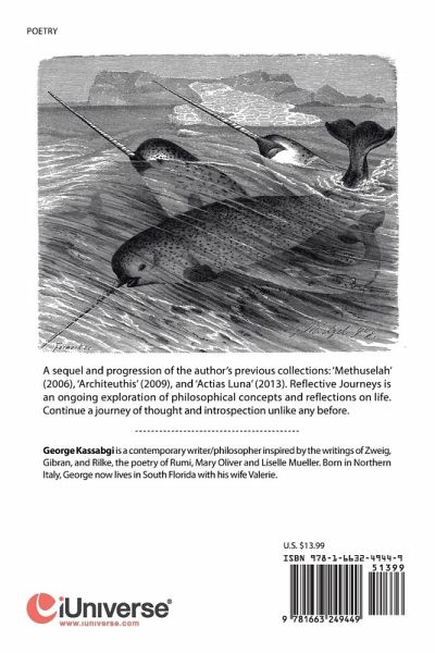 A sequel and progression of the author's previous collections: 'Methuselah' (2006), 'Architeuthis' (2009), and 'Actias Luna' (2013). Reflective Journeys is an ongoing exploration of philosophical concepts and reflections on life. Continue a journey of thought and introspection unlike any before. George Kassabgi is a contemporary writer/philosopher inspired by the writings of Zweig, Gibran, and Rilke, the poetry of Rumi, Mary Oliver and Liselle Mueller. Born in Northern Italy, George now lives in South Florida with his wife Valerie.