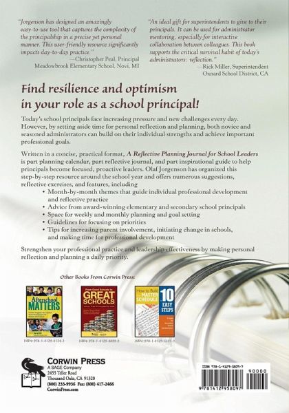 "Jorgenson has designed an amazingly easy-to-use tool that captures the complexity of the principalship in a precise, yet personal manner. This user-friendly resource significantly impacts day-to-day practice."-Christopher Peal, PrincipalMeadowbrook Elementary School, Novi, MI"An ideal gift for superintendents to give to their principals. It can be used for administrator mentoring, especially for interactive collaboration between colleagues. This book supports the critical survival habit of today's administrators: reflection."-Rick Miller, SuperintendentOxnard School District, CAFind resilience and optimism in your role as a school principal!Today's school principals face increasing pressure and new challenges every day. However, by setting aside time for personal reflection and planning, both novice and seasoned administrators can build on their individual strengths and achieve important professional goals. Written in a concise, practical format, A Reflective Planning Journal for School Leaders is part planning calendar, part reflective journal, and part inspirational guide to help principals become focused, proactive leaders. Olaf Jorgenson has organized this step-by-step resource around the school year and offers numerous suggestions, reflective exercises, and features, including: Month-by-month themes that guide individual professional development and reflective practiceAdvice from award-winning elementary and secondary school principalsSpace for weekly and monthly planning and goal settingGuidelines for focusing on priorities Tips for increasing parent involvement, initiating change in schools, and making time for professional developmentStrengthen your professional practice and leadership effectiveness by making personal reflection and planning a daily priority.