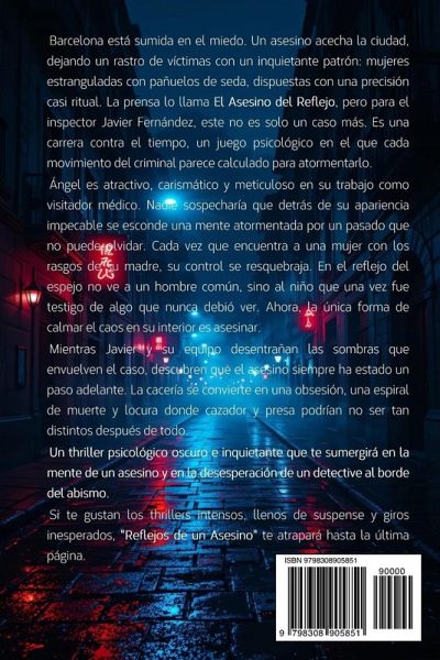 Reflejos de un Asesino. Barcelona está sumida en el miedo. Un asesino acecha la ciudad, dejando un rastro de víctimas con un inquietante patrón: mujeres estranguladas con pañuelos de seda, dispuestas con una precisión casi ritual. La prensa lo llama El Asesino del Reflejo, pero para el inspector Javier Fernández, este no es solo un caso más. Es una carrera contra el tiempo, un juego psicológico en el que cada movimiento del criminal parece calculado para atormentarlo. Ángel es atractivo, carismático y meticuloso en su trabajo como visitador médico. Nadie sospecharía que detrás de su apariencia impecable se esconde una mente atormentada por un pasado que no puede olvidar. Cada vez que encuentra a una mujer con los rasgos de su madre, su control se resquebraja. En el reflejo del espejo no ve a un hombre común, sino al niño que una vez fue testigo de algo que nunca debió ver. Ahora, la única forma de calmar el caos en su interior es asesinar. Mientras Javier y su equipo desentrañan las sombras que envuelven el caso, descubren que el asesino siempre ha estado un paso adelante. La cacería se convierte en una obsesión, una espiral de muerte y locura donde cazador y presa podrían no ser tan distintos después de todo. Un thriller psicológico oscuro e inquietante que te sumergirá en la mente de un asesino y en la desesperación de un detective al borde del abismo. Si te gustan los thrillers intensos, llenos de suspense y giros inesperados, "Reflejos de un Asesino" te atrapará hasta la última página.