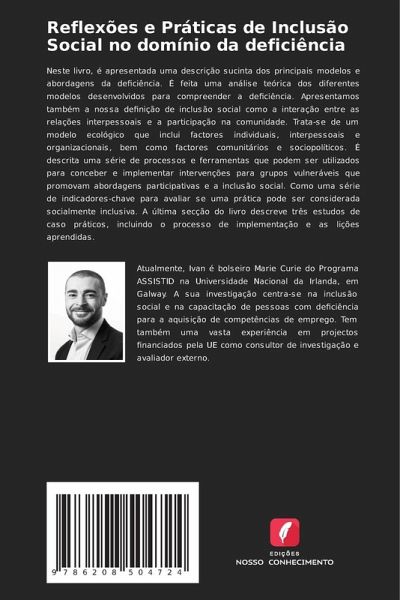 Neste livro, é apresentada uma descrição sucinta dos principais modelos e abordagens da deficiência. É feita uma análise teórica dos diferentes modelos desenvolvidos para compreender a deficiência. Apresentamos também a nossa definição de inclusão social como a interação entre as relações interpessoais e a participação na comunidade. Trata-se de um modelo ecológico que inclui factores individuais, interpessoais e organizacionais, bem como factores comunitários e sociopolíticos. É descrita uma série de processos e ferramentas que podem ser utilizados para conceber e implementar intervenções para grupos vulneráveis que promovam abordagens participativas e a inclusão social. Como uma série de indicadores-chave para avaliar se uma prática pode ser considerada socialmente inclusiva. A última secção do livro descreve três estudos de caso práticos, incluindo o processo de implementação e as lições aprendidas.
