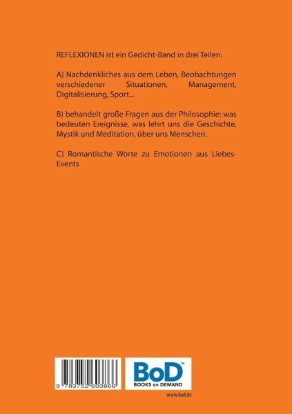 REFLEXIONEN ist ein Gedicht-Band in drei Teilen:A) Nachdenkliches aus dem Leben, Beobachtungen verschiedener Situationen, Management, Digitalisierung, Sport...B) behandelt große Fragen aus der Philosophie: was bedeuten Ereignisse, was lehrt uns die Geschichte, Mystik und Meditation, über uns Menschen.C) Romantische Worte zu Emotionen aus Liebes-Events