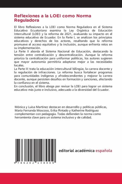 El libro Reflexiones a la LOEI como Norma Reguladora en el Sistema Educativo Ecuatoriano examina la Ley Orgánica de Educación Intercultural (LOEI) y la reforma de 2021, evaluando su impacto en el sistema educativo de Ecuador. En la Parte I, se analizan los principios educativos y derechos de los actores, resaltando que la reforma promueve el acceso equitativo y la inclusión, aunque enfrenta retos en su implementación.La Parte II aborda el Sistema Nacional de Educación, destacando la tensión entre centralización y descentralización. Aunque la reforma prioriza la centralización para uniformar políticas, los autores sugieren que mayor autonomía permitiría adaptarse mejor a las necesidades locales.La Parte III trata la educación intercultural bilingüe, la carrera docente y la regulación de infracciones. La reforma busca fortalecer programas para comunidades indígenas y afrodescendientes y mejorar la carrera docente, aunque persisten desafíos en formación y sanciones, afectando la confianza en el sistema.En conclusión, el libro aboga por revisar la LOEI para lograr un sistema educativo más justo e inclusivo, adecuado a la diversidad del Ecuador.
