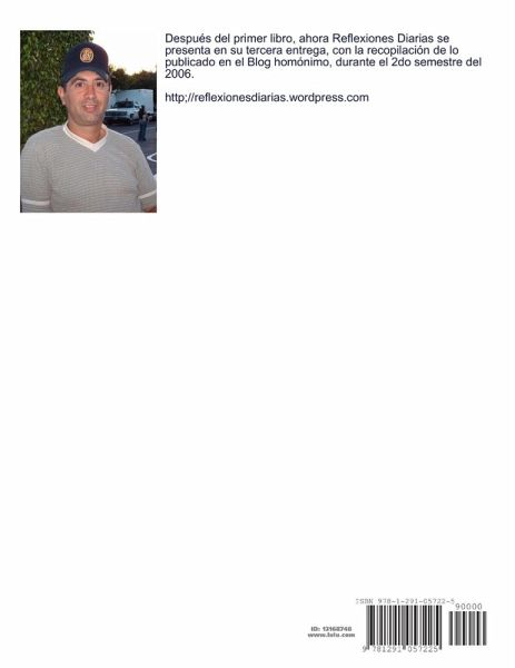 Después del primer libro, ahora Reflexiones Diarias se presenta en su tercera entrega, con la recopilación de lo publicado en el Blog homónimo, durante el 2do semestre del 2006. Tapa blanda, contenido en blanco y negro.