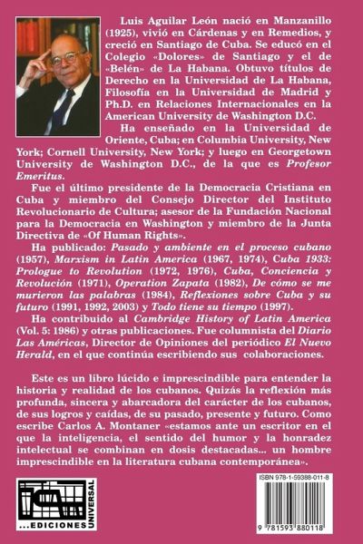 Luis Aguilar Leon was born in Manzanillo, Cuba in 1925 and died in exile in Miami in 2008. He studied Law at the University of Havana, Philosophy at the University of Madrid and received his PhD in International Relations from American University in Washington, D.C. He taught at Cornell University in New York and later at Georgetown University in Washington, where he was named Professor Emeritus. He published many books on Cuban history and was a contributor to the Cambridge History of Latin American (Vol. 5: 1986). He had a regular weekly column at the Diario Las Amerias and was the Opinions Director for El Nuevo Herald, where he also wrote articles on history and politics. This insightful book is necessary for understanding the history and current reality of the Cuban people. It is probably the most profound, sincere and encompassing reflection on the Cuban character, as well as their accomplishments and downfalls in the past, present and future. It is an analysis that explains the past as well as tries to give intellectual answers to the future. Included is his famous article: " El profeta habla de los cubanos". As Carlos Alberto Montaner says in his review of this book: "We stand before a writer whose intelligence, sense of humor and intellectual honesty stand out…an important figure in contemporary Cuba literature."