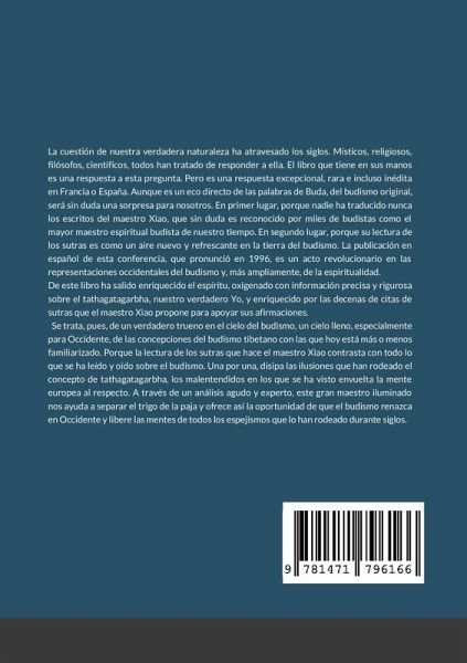 La cuestión de nuestra verdadera naturaleza ha atravesado los siglos. Místicos, religiosos, filósofos, científicos, todos han tratado de responder a ella. El libro que tiene en sus manos es una respuesta a esta pregunta. Pero es una respuesta excepcional, rara e incluso inédita en Francia o España. Aunque es un eco directo de las palabras de Buda, del budismo original, será sin duda una sorpresa para nosotros. En primer lugar, porque nadie ha traducido nunca los escritos del maestro Xiao Ping-Shi, que sin duda es reconocido por miles de budistas como el mayor maestro espiritual budista de nuestro tiempo. En segundo lugar, porque su lectura de los sutras es como un aire nuevo y refrescante en la tierra del budismo. La publicación en español de esta conferencia, que pronunció en 1996, es un acto revolucionario en las representaciones occidentales del budismo y, más ampliamente, de la espiritualidad. De este libro ha salido enriquecido el espíritu, oxigenado con información precisa y rigurosa sobre el tathagatagarbha, nuestro verdadero Yo, y enriquecido por las decenas de citas de sutras que el maestro Xiao propone para apoyar sus afirmaciones. Se trata, pues, de un verdadero trueno en el cielo del budismo, un cielo lleno, especialmente para Occidente, de las concepciones del budismo tibetano con las que hoy está más o menos familiarizado. Porque la lectura de los sutras que hace el maestro Xiao contrasta con todo lo que se ha leído y oído sobre el budismo. Una por una, disipa las ilusiones que han rodeado el concepto de tathagatagarbha, los malentendidos en los que se ha visto envuelta la mente europea al respecto. A través de un análisis agudo y experto, este gran maestro iluminado nos ayuda a separar el trigo de la paja y ofrece así la oportunidad de que el budismo renazca en Occidente y libere las mentes de todos los espejismos que lo han rodeado durante siglos.