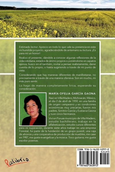 Estimado lector: Agradezco en todo lo que vale su presencia en este mi humilde proyecto, agradeciéndole de antemano su lectura. ¡Es para mí un honor! Realizo el presente, dándole a conocer algunas reflexiones de la vida cotidiana, estados de ánimo propios o poniéndome en zapatos ajenos; busco en el también, invitar a pensar realistamente, darse cuenta de lo propio, o hasta sugiriendo a través de mi punto de vista. Considerando que hay maneras diferentes de manifestarse, no precisamente a través de una manera ofensiva. Son en mucho, mi más puro sentir. Lo hago de manera completamente lirica, esperando su consideración. Ofelia García