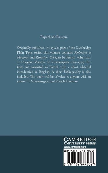 Originally published in 1936, as part of the Cambridge Plain Texts series, this volume contains Réflexions et maximes and Réflexions critiques by French writer Luc de Clapiers, Marquis de Vauvenargues (1715-47). The texts are presented in French with a short editorial introduction in English. A short bibliography is also included. This book will be of value to anyone with an interest in Vauvenargues and French literature.