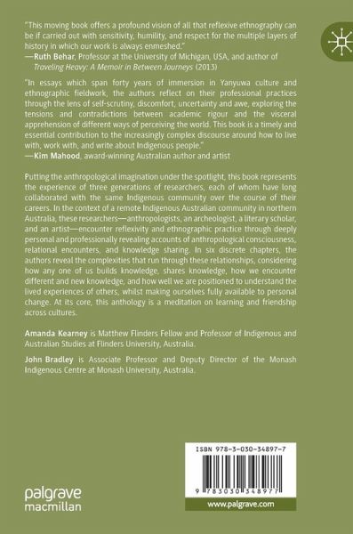 Putting the anthropological imagination under the spotlight, this book represents the experience of three generations of researchers, each of whom have long collaborated with the same Indigenous community over the course of their careers. In the context of a remote Indigenous Australian community in northern Australia, these researchers-anthropologists, an archeologist, a literary scholar, and an artist-encounter reflexivity and ethnographic practice through deeply personal and professionally revealing accounts of anthropological consciousness, relational encounters, and knowledge sharing. In six discrete chapters, the authors reveal the complexities that run through these relationships, considering how any one of us builds knowledge, shares knowledge, how we encounter different and new knowledge, and how well we are positioned to understand the lived experiences of others, whilst making ourselves fully available to personal change. At its core, this anthology is a meditationon learning and friendship across cultures.