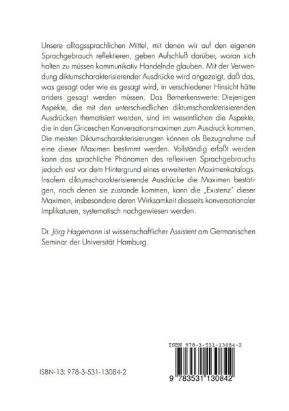 1 Einleitung.- 2 Kommunikatives Handeln.- 3 Metakommunikation.- 3.1 Formen der Metakommunikation.- 3.2 Entwicklung sprachreflexiver Fähigkeiten.- 3.3 Metakommunikative Strukturen.- 3.4 Funktionen metakommunikativer Äußerungen.- 4 Diktumscharakterisierung.- 4.1 Begriff, Bezeichnung und Bestimmung.- 4.2 Strukturen der Diktumscharakterisierung.- 4.3 Funktionen von Diktumscharakterisierungen.- 4.4 Motivation zur Diktumscharakterisierung.- 5 Diktumscharakterisierung als Sprechakt?.- 5.1 Bedeutung und Gebrauch.- 5.2 Das Gricesche 'Programm'.- 5.3 Diktumscharakterisierungen als nicht-zentrale Sprechakte.- 5.4 Das Gesagte und dessen Verwendung.- 6 Diktumscharakterisierung aus Gricescher Sicht.- 6.1 Die Gricesche Sicht.- 6.2 Zur Verallgemeinerung der Konversationsmaximen.- 6.3 Der Zusammenhang zwischen Diktumscharakterisierungen und Konversationsmaximen.- 7 Diktumscharakterisierung in der Illokutionslogik.- 7.1 Illokutionäre Kräfte: Komponenten und Operationen.- 7.2 Diktumscharakterisierungen als Ausdrucksmittel für Illokutionskraft-Komponenten.- 8 Einzelanalysen.- 8.1 Bezugnahmen auf die Konversationsmaximen der Quantität.- 8.2 Bezugnahmen auf die Konversationsmaximen der Qualität.- 8.3 Bezugnahmen auf die Konversationsmaximen der Relation.- 8.4 Bezugnahmen auf die Konversationsmaximen der Modalität.- 9 Diktumscharakterisierungen über die Gricesche Sicht hinaus.- 9.1 Diktumscharakterisierungen, die übrig bleiben.- 9.2 Eine fünfte Modalitätsmaxime.- 10 Schlußbetrachtung.- Verzeichnis zentraler Begriffe und Thesen.- Auflistung diktumscharakterisierender Ausdrücke.- Namenverzeichnis.