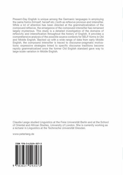 Present-Day English is unique among the Germanic languages in employing the same forms ( himself , herself etc.) both as reflexive pronoun and intensifier. While a lot of attention has been directed at the grammaticalization of the compound reflexive, the emergence of the compound intensifier has remained largely mysterious. This study is a detailed investigation of the domains of reflexivity and intensification throughout the history of English. It provides a comprehensive analysis of the possible source contexts for SELF-forms in Old and Middle English. Backed up with a wide range of data from early Middle English, the compound intensifier is traced to discourse-pragmatic motivations: expressive strategies linked to specific discourse traditions become rapidly grammaticalized once the former Old English standard gave way to large-scale variation in Middle English.