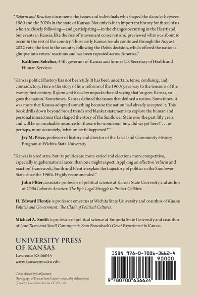 Originating under the leadership of the late Burdett Loomis, Reform and Reaction tells the complex story of recent Kansas politics, beginning in the 1960s and concluding with the reversal of Governor Sam Brownback's red-state policies in the 2016 and 2018 elections. The Kansas that emerged from the reapportionment decisions and the overhaul of state government in the 1960s and 1970s was one that found itself in a push-and-pull, reform-and-reaction pattern the authors refer to as the arc of Kansas politics. Reform-minded and policy-oriented politicians who tended toward a moderate, bipartisan approach pushed to modernize the state to better serve the needs of its citizens, following the maxim of Governor Robert Docking: "austere but adequate." Because this approach avoided or rejected the narrow conservative interests of culture warriors, reformist administrations were followed by reactionary administrations that advanced a right-wing agenda. Brownback thus brought the era of "austere but adequate" to an abrupt end when he won the governorship in 2010. When voters became tired of this approach, a new set of reform politicians were elected--and so the arc continues. The only book tracing changes in Kansas government since the 1960s, including the loss of moderates in both parties, the Brownback era, and its aftermath, Reform and Reaction is the last book by the celebrated political scientist Burdett Loomis, who conceived the idea for the book and authored one of its chapters before his passing. Reform and Reaction not only illuminates the political history of Kansas but also sheds light on what may be in store for the future of the Sunflower State.