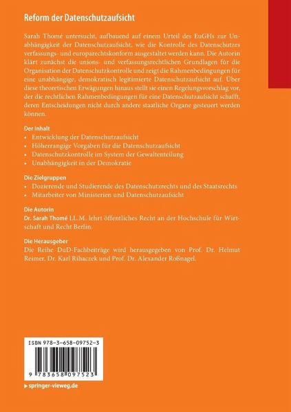 Sarah Thomé untersucht, aufbauend auf einem Urteil des EuGHs zur Unabhängigkeit der Datenschutzaufsicht, wie die Kontrolle des Datenschutzes verfassungs- und europarechtskonform ausgestaltet werden kann. Die Autorin klärt zunächst die unions- und verfassungsrechtlichen Grundlagen für die Organisation der Datenschutzkontrolle und zeigt die Rahmenbedingungen für eine unabhängige, demokratisch legitimierte Datenschutzaufsicht auf. Über diese theoretischen Erwägungen hinaus stellt sie einen Regelungsvorschlag vor, der die rechtlichen Rahmenbedingungen für eine Datenschutzaufsicht schafft, deren Entscheidungen nicht durch andere staatliche Organe gesteuert werden können.