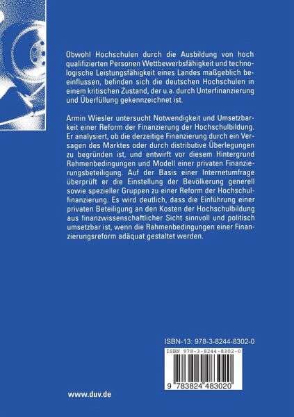 Armin Wiesler untersucht Notwendigkeit und Umsetzbarkeit einer Reform der Finanzierung der Hochschulbildung. Er analysiert, ob die derzeitige Finanzierung durch ein Versagen des Marktes oder durch distributive Überlegungen zu begründen ist, und entwirft vor diesem Hintergrund Rahmenbedingungen und Modell einer privaten Finanzierungsbeteiligung. Auf der Basis einer Internetumfrage überprüft er die Einstellung der Bevölkerung generell sowie spezieller Gruppen zu einer Reform der Hochschulfinanzierung. Es wird deutlich, dass die Einführung einer privaten Beteiligung an den Kosten der Hochschulbildung aus finanzwissenschaftlicher Sicht sinnvoll und politisch umsetzbar ist, wenn die Rahmenbedingungen einer Finanzierungsreform adäquat gestaltet werden.