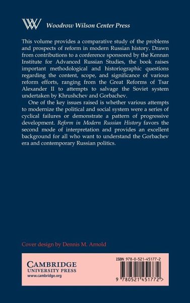 This volume provides a comparative study of the problems and prospects of reform in modern Russian history. Drawn from contributions to a conference sponsored by the Kennan Institute for Advanced Russian Studies of the Woodrow Wilson International Center for Scholars, the book raises important methodological and historiographic questions regarding the content, scope, and significance of various reform efforts, ranging from the Great Reforms of Tsar Alexander II to attempts undertaken by Khrushchev and Gorbachev to salvage the Soviet system. One of the recurrent themes raised is whether these attempts to modernize the political and social system were a cyclical series of failures or demonstrate a pattern of progressive development. Reform in Modern Russian History favors the latter interpretation and provides an excellent background for all who want to understand the shape of modern Russian history, the significance of Gorbachev, and the roots of contemporary Russian politics.