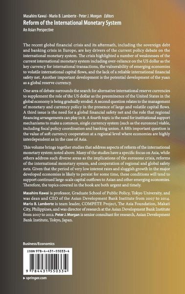 Ch 1 Reform of the International Monetary System: Introduction and Overview (Masahiro Kawai, Peter J. Morgan) Part I International Monetary System Reforms Ch 2 International Monetary Reform: A Critical Appraisal of Some Proposals (Yung Chul Park, Charles Wyplosz) Part II Managing International Capital Flows Ch 3 Rethinking Capital Flows for Emerging East Asia (Stephen Grenville).- Ch 4 New Measures of the Trilemma Hypothesis: Implications for Asia (Hiro Ito, Masahiro Kawai) Part III Asian Currency Arrangements.- Ch 5 Revisiting the Internationalization of the Yuan (Yongding Yu).- Ch 6 Exchange Rate Coordination in Asia: Evidence Using an Asian Currency Unit (Abhijit Sen Gupta) Part IV Regional Financial Cooperation Ch 7 Europe's Crisis, Coordination Failure, and International Effects (Stefan Collignon).- Ch 8 Prevention and Resolution of Foreign Exchange Crises in East Asia (Chalongphob Sussangkarn) Part V Linking Regional and Global Initiatives Ch 9 Regional and Global Monetary Cooperation (Mario B. Lamberte, Peter J. Morgan).