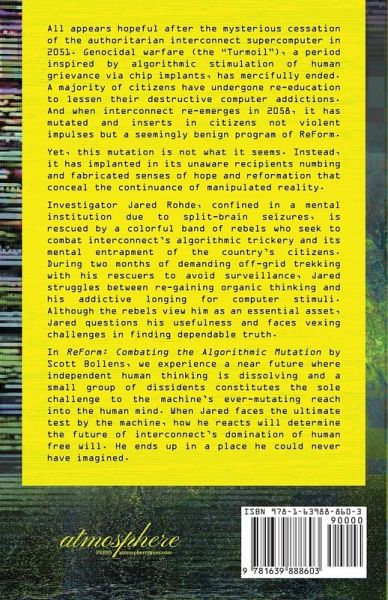All appears hopeful after the mysterious cessation of the authoritarian interconnect supercomputer in 2051. Genocidal warfare (the "Turmoil"), a period inspired by algorithmic stimulation of human grievance via chip implants, has mercifully ended. A majority of citizens have undergone re-education to lessen their destructive computer addictions. And when interconnect re-emerges in 2058, it has mutated and inserts in citizens not violent impulses but a seemingly benign program of ReForm. Yet, this mutation is not what it seems. Instead, it has implanted in its unaware recipients numbing and fabricated senses of hope and reformation that conceal the continuance of manipulated reality. Investigator Jared Rohde, confined in a mental institution due to split-brain seizures, is rescued by a colorful band of rebels who seek to combat interconnect's algorithmic trickery and its mental entrapment of the country's citizens. During two months of demanding off-grid trekking with his rescuers to avoid surveillance, Jared struggles between re-gaining organic thinking and his addictive longing for computer stimuli. Although the rebels view him as an essential asset, Jared questions his usefulness and faces vexing challenges in finding dependable truth. In ReForm: Combating the Algorithmic Mutation by Scott Bollens, we experience a near future where independent human thinking is dissolving and a small group of dissidents constitutes the sole challenge to the machine's ever-mutating reach into the human mind. When Jared faces the ultimate test by the machine, how he reacts will determine the future of interconnect's domination of human free will. He ends up in a place he could never have imagined.