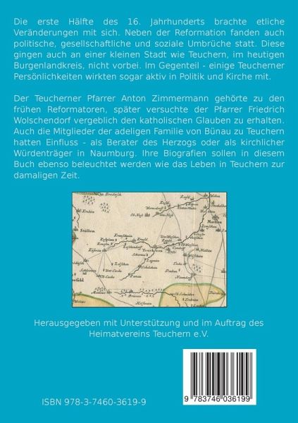 Die erste Hälfte des 16. Jahrhunderts brachte etliche Veränderungen mit sich. Neben der Reformation fanden auch politische, gesellschaftliche und soziale Umbrüche statt. Diese gingen auch an einer kleinen Stadt wie Teuchern, im heutigen Burgenlandkreis, nicht vorbei. Im Gegenteil - einige Teucherner Persönlichkeiten wirkten sogar aktiv in Politik und Kirche mit.Der Teucherner Pfarrer Anton Zimmermann gehörte zu den frühen Reformatoren, später versuchte der Pfarrer Friedrich Wolschendorf vergeblich, den katholischen Glauben zu erhalten. Auch die Mitglieder der adeligen Familie von Bünau zu Teuchern hatten Einfluss - als Berater des Herzogs oder als kirchlicher Würdenträger in Naumburg. Ihre Biografien sollen in diesem Buch ebenso beleuchtet werden wie das Leben in Teuchern zur damaligen Zeit.