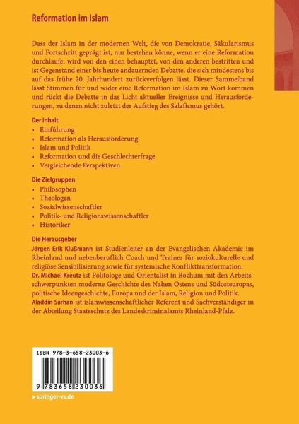 Dass der Islam in der modernen Welt, die von Demokratie, Säkularismus und Fortschritt geprägt ist, nur bestehen könne, wenn er eine Reformation durchlaufe, wird von den einen behauptet, von den anderen bestritten und ist Gegenstand einer bis heute andauernden Debatte, die sich mindestens bis auf das frühe 20. Jahrhundert zurückverfolgen lässt. Dieser Sammelband lässt Stimmen für und wider eine Reformation im Islam zu Wort kommen und rückt die Debatte in das Licht aktueller Ereignisse und Herausforderungen, zu denen nicht zuletzt der Aufstieg des Salafismus gehört.
