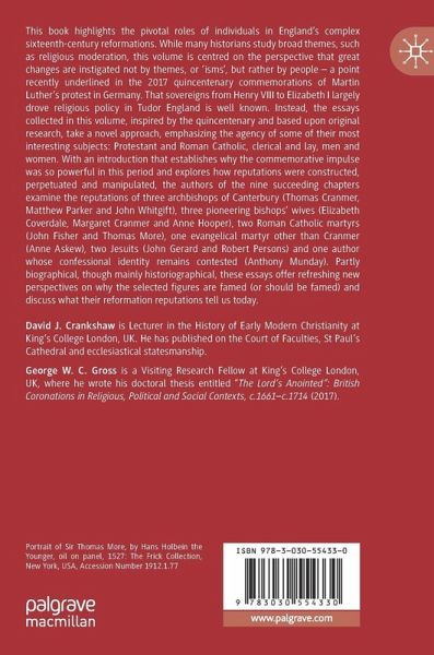 This book highlights the pivotal roles of individuals in England's complex sixteenth-century reformations. While many historians study broad themes, such as religious moderation, this volume is centred on the perspective that great changes are instigated not by themes, or 'isms', but rather by people - a point recently underlined in the 2017 quincentenary commemorations of Martin Luther's protest in Germany. That sovereigns from Henry VIII to Elizabeth I largely drove religious policy in Tudor England is well known. Instead, the essays collected in this volume, inspired by the quincentenary and based upon original research, take a novel approach, emphasizing the agency of some of their most interesting subjects: Protestant and Roman Catholic, clerical and lay, men and women. With an introduction that establishes why the commemorative impulse was so powerful in this period and explores how reputations were constructed, perpetuated and manipulated, the authors of the nine succeeding chapters examine the reputations of three archbishops of Canterbury (Thomas Cranmer, Matthew Parker and John Whitgift), three pioneering bishops' wives (Elizabeth Coverdale, Margaret Cranmer and Anne Hooper), two Roman Catholic martyrs (John Fisher and Thomas More), one evangelical martyr other than Cranmer (Anne Askew), two Jesuits (John Gerard and Robert Persons) and one author whose confessional identity remains contested (Anthony Munday). Partly biographical, though mainly historiographical, these essays offer refreshing new perspectives on why the selected figures are famed (or should be famed) and discuss what their reformation reputations tell us today.
