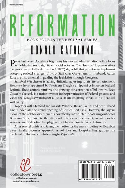 President Perry Douglas is beginning his nascent administration with a focus on achieving some significant social reforms. The House of Representatives has passed an anti-discrimination LGBTQ rights bill that promises to implement sweeping societal changes. Chief of Staff Clay Grover and his husband, Aaron Rose are instrumental in guiding the legislation through Congress. Stanford Winchester is having difficulty adjusting to his life in retirement. However, he is appointed by President Douglas as Special Advisor on Judicial Reform. These actions reinforce the growing consternation of billionaire, Race Casserly. Casserly is a major investor in the privatization of Federal prisons, and views the Douglas/Winchester alliance as an imposing threat to his financial well-being. Together with Stanford and his wife Whitlee, Bessie Collins and her husband Lucius celebrate the grand opening of Bessie's Best Pies. However, the joyous mood of the celebratory dinner is horrifically interrupted. Shots ring out down Bourbon Street. And in the aftermath, the casualties mount, as yet another senseless mass shooting has plagued the blood-soaked streets of America. After several twists and turns, the motive for the mass shooting on Bourbon Street finally becomes apparent, as old foes and long-standing grudges are disclosed in the suspenseful ending to Reformation.
