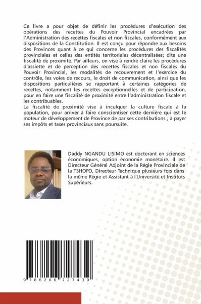 Ce livre a pour objet de définir les procédures d'exécution des opérations des recettes du Pouvoir Provincial encadrées par l'Administration des recettes fiscales et non fiscales, conformément aux dispositions de la Constitution. Il est conçu pour répondre aux besoins des Provinces quant à ce qui concerne les procédures des fiscalités provinciales et celles des entités territoriales décentralisées; dite une fiscalité de proximité. Par ailleurs, on vise à rendre claire les procédures d'assiette et de perception des recettes fiscales et non fiscales du Pouvoir Provincial, les modalités de recouvrement et l'exercice du contrôle, les voies de recours, le droit de communication, ainsi que les dispositions particulières se rapportant a certaines catégories de recettes, notamment les recettes exceptionnelles et de participation, pour en faire une fiscalité de proximité entre l'administration fiscale et les contribuables.La fiscalité de proximité vise à inculquer la culture fiscale à la population, pour arriver à faire conscientiser cette dernière qui est le moteur de développement de Province de par ses contributions ; à payer ses impôts et taxes provinciaux sans poursuite.