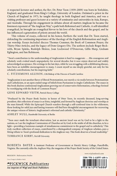 A respected lecturer and author, the Rev. Dr. Peter Toon (1939-2009) was born in Yorkshire, England, and graduated from King's College, University of London. Ordained a priest in the Church of England in 1973, he taught theology in both England and America, and was a visiting professor and guest lecturer at a variety of seminaries and universities in Asia, Europe, and Australia. Through his engagement in debates about all matters Anglican, he became the foremost exponent of ""the Anglican Way,"" a path both Reformed and Catholic. A self-identified evangelical, he brought an evangelical fervor to his love of the church and the gospel, and he has influenced a generation of priests around the world. This volume of essays, collected in his honor, furthers the work that Dr. Toon started, defending the continuing importance of the theology of the English Reformation and Anglican worship. Essays included discuss Thomas Cranmer, the Book of Common Prayer, the Thirty-Nine Articles, and the legacy of Dom Gregory Dix. The authors include Roger Beckwith, Bryan Spinks, Rudolph Heinze, Joan Lockwood O'Donovan, Gillis Harp, Graham Eglington, and Ian Robinson.