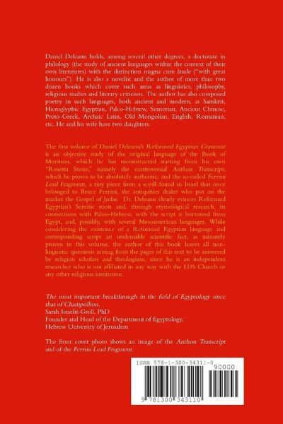 The first volume of the "Reformed Egyptian Grammar" by Daniel Deleanu, PhD, is an objective study of the original language of the Book of Mormon, which he has reconstructed starting from his own "Rosetta Stone," namely the controversial "Anthon Transcript," which he proves to be absolutely authentic, and the so-called "Ferrini Lead Fragment," a tiny piece from a scroll found in Israel that once belonged to Bruce Ferrini, the antiquities dealer who put on the market the Gospel of Judas. Dr. Deleanu clearly evinces Reformed Egyptian's Semitic roots and, through etymological research, its connections with Paleo-Hebrew, with the script it borrowed from Egypt, and, possibly, with several Mesoamerican languages. Dr. Deleanu, who holds a doctorate magna cum laude in philology (the study of ancient languages and literatures) is an independent researcher who is not affiliated in any way with the LDS Church or any other religious institution.