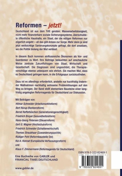 "Die Beiträge liefern für die Reformdebatte eine Fülle von Argumenten, die sich lohnen nicht nur diskutiert, sondern auch umgesetzt zu werden."Arbeitgeber, 10/2004 "Das Buch gibt einen guten Überblick über die Problemfelder und wird wohlnoch lange aktuell bleiben (...)." Rheinischer Merkur, 19.02.2004 "Die Diagnosen sind ungeschönt, die Therapievorschläge ebenso unbequem wie ehrlich. Sie machen Mut, dass es Deutschland gelingen kann, in die Erfolgsspur zurückzufinden." Nordkurier, 17.04.2004 "In diesem Buch kommen einflussreiche Ökonomen als Vor- und Querdenker zu Wort. Ihre Beiträge beleuchten auf anschauliche Weise zentrale Zukunftsfragen von Staat, Wirtschaft und Gesellschaft." www.boerse.de, 26.04.2004