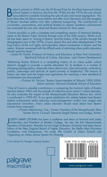 "One of Cronin's valuable contributions is comparing the minimal rights of Boston teachers before 1965 with the strength of collective union action in recent decades. He also evaluates the impact of the Massachusetts Education Reform Act, which I co-authored in 1992-93.To our great satisfaction this statute helped raise Boston student achievement while reducing union-management conflict over wages and educational innovation. Every urban educator should read about how Boston schools have improved." - Thomas Birmingham, Esq., Former President of the Massachusetts State Senate Senior Counsel; Edwards Angell Palmer and Dodge, Boston
