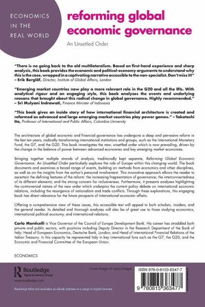 The architecture of global economic and financial governance has undergone a deep and pervasive reform in the last ten years, radically transforming international institutions and groups, such as the International Monetary Fund, the G7, and the G20. This book investigates the new, unsettled order which is now prevailing, driven by the change in the balance of power between advanced economies and key emerging market economies. Bringing together multiple strands of analysis, traditionally kept separate, Reforming Global Economic Governance: An Unsettled Order particularly explores the role of Europe within this changing world. The book documents and examines a broad range of events, building on methods from economics and other disciplines, as well as on the insights from the author's personal involvement. This innovative approach allows the reader to ascertain the defining features of the reform: the increasing fragmentation of governance; the interconnectedness of its different elements; and the strong concern for inclusiveness. Furthermore, it presents analyses highlighting the controversial nature of the new order which underpins the current policy debate on international economic relations, including the resurgence of nationalism and trade conflicts. Through these explorations, this engaging book has direct relevance for the future prospects of international economic affairs. Offering a comprehensive view of these issues, this accessible text will appeal to scholars, insiders, and the general reader. Its detailed and thorough analyses will also be of great use to those studying economics, international political economy, and international relations.