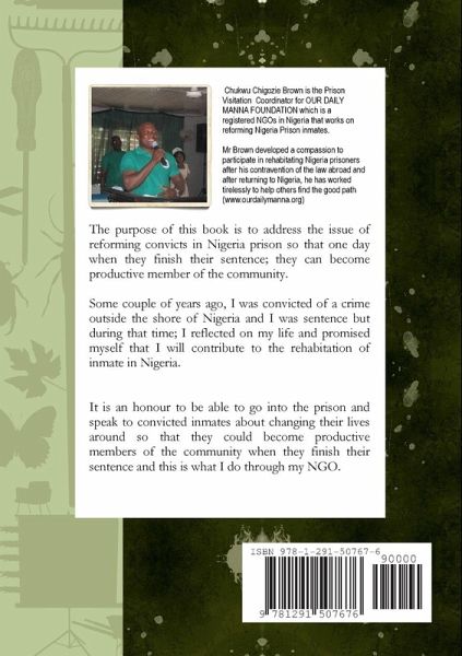 The purpose of this book is to address the issue of reforming convicts in Nigeria prison so that one day when they finish their sentence; they can become productive member of the community. Some couple of years ago, I was convicted of a crime outside the shore of Nigeria and I was sentence but during that time; I reflected on my life and promised myself that I will contribute to the rehabitation of inmate in Nigeria. It is an honour to be able to go into the prison and speak to convicted inmates about changing their lives around so that they could become productive members of the community when they finish their sentence and this is what I do through my NGO.