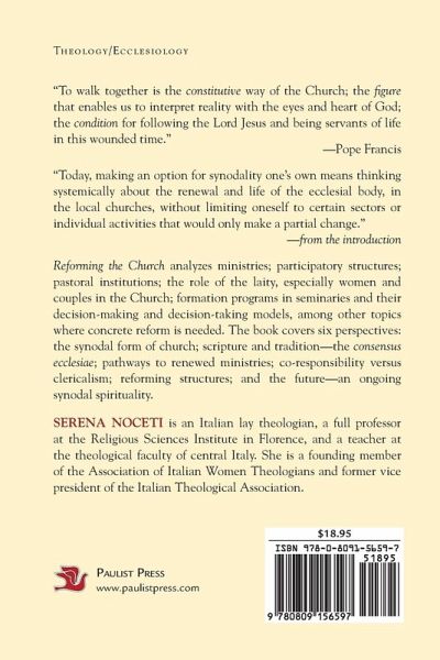 "To walk together is the constitutive way of the Church; the figure that enables us to interpret reality with the eyes and heart of God; the condition for following the Lord Jesus and being servants of life in this wounded time." --Pope Francis "Today, making an option for synodality one's own means thinking systemically about the renewal and life of the ecclesial body, in the local churches, without limiting oneself to certain sectors or individual activities that would only make a partial change." --from the introduction Reforming the Church analyzes ministries; participatory structures; pastoral institutions; the role of the laity, especially women and couples in the Church; formation programs in seminaries and their decision-making and decision-taking models, among other topics where concrete reform is needed. The book covers six perspectives: the synodal form of church; scripture and tradition--the consensus ecclesiae; pathways to renewed ministries; co-responsibility versus clericalism; reforming structures; and the future--an ongoing synodal spirituality. Serena Noceti is an Italian lay theologian, a full professor at the Religious Sciences Institute in Florence, and a teacher at the theological faculty of central Italy. She is a founding member of the Association of Italian Women Theologians and former vice president of the Italian Theological Association. +
