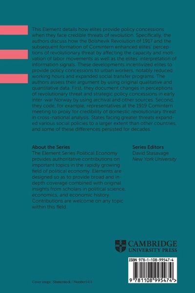 This Element details how elites provide policy concessions when they face credible threats of revolution. Specifically, the authors discuss how the Bolshevik Revolution of 1917 and the subsequent formation of Comintern enhanced elites' perceptions of revolutionary threat by affecting the capacity and motivation of labor movements as well as the elites' interpretation of information signals. These developments incentivized elites to provide policy concessions to urban workers, notably reduced working hours and expanded social transfer programs. The authors assess their argument by using original qualitative and quantitative data. First, they document changes in perceptions of revolutionary threat and strategic policy concessions in early inter-war Norway by using archival and other sources. Second, they code, for example, representatives at the 1919 Comintern meeting to proxy for credibility of domestic revolutionary threat in cross-national analysis. States facing greater threats expanded various social policies to a larger extent than other countries, and some of these differences persisted for decades.