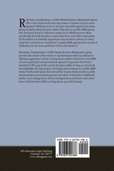 A volume in Contemporary Human Resource Management: Issues, Challenges, and Opportunities Series Editor Ronald R. Sims, College of William and Mary This book offers a first-hand look at the importance of human resource management (HRM) processes to not just one public agency but a large group of public administration entities that rely on a public HRM agency (the Personnel Board of Jefferson County) for its HRM processes. More specifically, the book describes a more than three-year effort undertaken by the author as a federally-appointed court receiver to reform (or what some have referred to as "transform") a public HRM agency from a model of inefficiency to one now considered "best in the business". The book provides the details of the reform or transformation effort in addition to offering suggestions on how to bring about similar civil services and HRM reform in particular and government agencies in general. The book is intended to fill a gap in the current literature while serving as a key work that highlights the importance of bringing about change in a public HRM entity. Timely and topical, the book will be of great interest both to public administration personnel in general, and others in the fields of HRM and public sector management, and to management practitioners and others keen to inform their ability to bring about successful change.