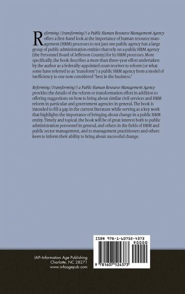 A volume in Contemporary Human Resource Management: Issues, Challenges, and Opportunities Series Editor Ronald R. Sims, College of William and Mary This book offers a first-hand look at the importance of human resource management (HRM) processes to not just one public agency but a large group of public administration entities that rely on a public HRM agency (the Personnel Board of Jefferson County) for its HRM processes. More specifically, the book describes a more than three-year effort undertaken by the author as a federally-appointed court receiver to reform (or what some have referred to as "transform") a public HRM agency from a model of inefficiency to one now considered "best in the business". The book provides the details of the reform or transformation effort in addition to offering suggestions on how to bring about similar civil services and HRM reform in particular and government agencies in general. The book is intended to fill a gap in the current literature while serving as a key work that highlights the importance of bringing about change in a public HRM entity. Timely and topical, the book will be of great interest both to public administration personnel in general, and others in the fields of HRM and public sector management, and to management practitioners and others keen to inform their ability to bring about successful change.