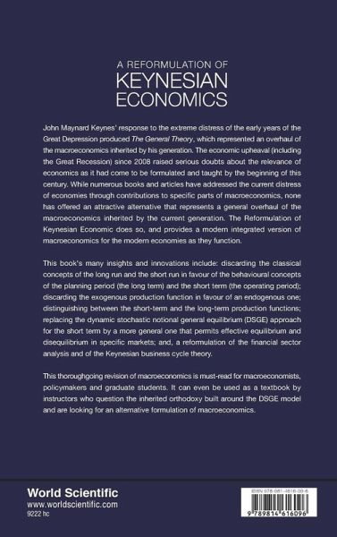John Maynard Keynes' response to the extreme distress of the early years of the Great Depression produced The General Theory, which represented an overhaul of the macroeconomics inherited by his generation. The economic upheaval (including the Great Recession) since 2008 raised serious doubts about the relevance of economics as it had come to be formulated and taught by the beginning of this century. While numerous books and articles have addressed the current distress of economies through contributions to specific parts of macroeconomics, none has offered an attractive alternative that represents a general overhaul of the macroeconomics inherited by the current generation. The Reformulation of Keynesian Economic does so, and provides a modern integrated version of macroeconomics for the modern economies as they function. This book's many insights and innovations include: discarding the classical concepts of the long run and the short run in favour of the behavioural concepts of the planning period (the long term) and the short term (the operating period); discarding the exogenous production function in favour of an endogenous one; distinguishing between the short-term and the long-term production functions; replacing the dynamic stochastic notional general equilibrium (DSGE) approach for the short term by a more general one that permits effective equilibrium and disequilibrium in specific markets; and, a reformulation of the financial sector analysis and of the Keynesian business cycle theory. This thoroughgoing revision of macroeconomics is must-read for macroeconomists, policymakers and graduate students. It can even be used as a textbook by instructors who question the inherited orthodoxy built around the DSGE model and are looking for an alternative formulation of macroeconomics.