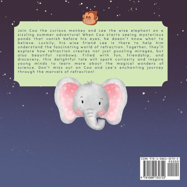 "Introduce your young child to the wonders of STEM with this book! This fun and educational science book is perfect for parents who want to inspire their child's curiosity about science. Use it as a baby book or an elementary book. A great science-fiction book" Discover the enchanting world of Coo the curious monkey and Lee the wise elephant in this captivating children's book, perfect for a hot summer day read! Filled with adventure, learning, and fun, this delightful story follows Coo as he encounters mirages in the jungle and struggles to understand the mysterious ponds that vanish before his eyes. With the help of his wise friend Lee, Coo learns about the fascinating concept of refraction, which not only creates intriguing mirages but also breathtaking rainbows. This beautifully illustrated book, ideal for young readers, combines engaging storytelling with essential science concepts. The engaging narrative is sure to ignite children's imaginations and inspire them to explore the wonders of nature and science. "Refraction - That Bends the Light." is a must-have addition to any child's library. It's a charming tale that encourages curiosity, learning, and a love for the natural world. Don't miss out on this delightful journey through the marvels of refraction with Coo and Lee! Order your copy today and watch your little ones dive into the magical world of science and discovery.A STEM focused Science book for young kids. Use it as a baby book or an elementary book for kids 4-8 years A science-fiction book or technology fiction book for kids Charming and colorful illustrations of friendly wild animal characters Promotes kids imagination and learning in a humorous way A great addition to a young child's bookshelf Grade level: Preschool - 4th Grade (book for 0-3 years, 3-6 years and 4-8 years) Simple words for level 1 readers and level 2 readers Great book for parents to read to young kids