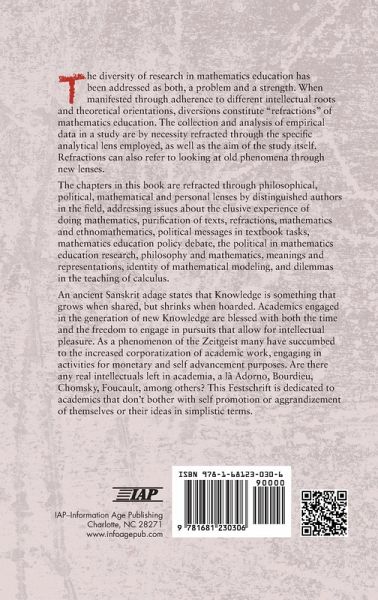 A Volume in Cognition, Equity & Society: International Perspectives formally known as International Perspectives on Mathematics Education - Cognition, Equity & Society Series Editor Bharath Sriraman, The University of Montana and Lyn English, Queensland University of Technology The diversity of research in mathematics education has been addressed as both, a problem and a strength. When manifested through adherence to different intellectual roots and theoretical orientations, diversions constitute 'refractions' of mathematics education. The collection and analysis of empirical data in a study are by necessity refracted through the specific analytical lens employed, as well as the aim of the study itself. Refractions can also refer to looking at old phenomena through new lenses. The chapters in this book are refracted through philosophical, political, mathematical and personal lenses by distinguished authors in the field, addressing issues about the elusive experience of doing mathematics, purification of texts, refractions, mathematics and ethnomathematics, political messages in textbook tasks, mathematics education policy debate, the political in mathematics education research, philosophy and mathematics, meanings and representations, identity of mathematical modeling, and dilemmas in the teaching of calculus. An ancient Sanskrit adage states that Knowledge is something that grows when shared, but shrinks when hoarded. Academics engaged in the generation of new Knowledge are blessed with both the time and the freedom to engage in pursuits that allow for intellectual pleasure. As a phenomenon of the Zeitgeist many have succumbed to the increased corporatization of academic work, engaging in activities for monetary and self advancement purposes. Are there any real intellectuals left in academia, a là Adorno, Bourdieu, Chomsky, Foucault, among others? This Festschrift is dedicated to academics that don't bother with self promotion or aggrandizement of themselves or their ideas in simplistic terms.