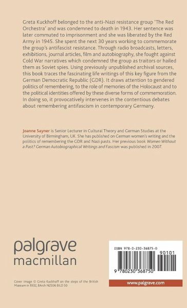 'Of the various studies on the debate surrounding anti-Fascism and resistance in the GDR, Joanne Sayner's research into the life writings of Greta Kuckhoff provides a wealth of new material relating to this less well-known figure of Nazi resistance and the GDR public sphere. Most importantly, her book provides insights from the life of a woman in high positions fighting for an appropriate public remembrance of the anti-Fascist resisters she alone outlived.' - Modern Language Review