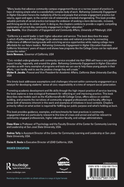 "California is a world leader in both higher education and service. This book describes the ways in which #CaliforniansForAll College Corps advances state and national priorities by connecting Californians of different backgrounds with enriching service opportunities while making college more affordable for our future leaders. Reframing Community Engagement in Higher Education illustrates California Volunteers' years of impact and shows how programs like the College Corps can be replicated across the nation."