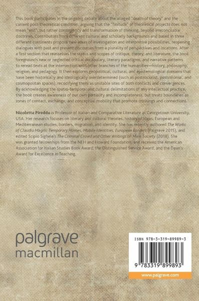 This book participates in the ongoing debate about the alleged "death of theory" and the current post-theoretical condition, arguing that the "finitude" of theoretical projects does not mean "end", but rather contingency and transformation of thinking, beyond irreconcilable doctrines. Contributors from different cultural and scholarly backgrounds and based in three different continents propose new areas of investigation and interpretive possibilities, reopening dialogues with past and present discourses from a plurality of perspectives and locations. After a first section that reassesses the status and scopes of critique, theory, and literature, the book foregrounds new or neglected critical vocabulary, literary paradigms, and narrative patterns to reread texts at the intersection with other branches of the humanities-history, philosophy, religion, and pedagogy. It then explores geopolitical, cultural, and epistemological domains that have been historically and ideologically overdetermined (such as postsocialist, postcolonial, and cosmopolitan spaces), recodifying them as unstable sites of both conflicts and convergences. By acknowledging the spatio-temporal and cultural delimitations of any intellectual practice, the book creates awareness of our own partiality and incompleteness, but treats boundaries as zones of contact, exchange, and conceptual mobility that promote crossings and connections.