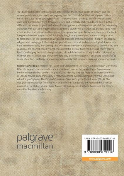This book participates in the ongoing debate about the alleged "death of theory" and the current post-theoretical condition, arguing that the "finitude" of theoretical projects does not mean "end", but rather contingency and transformation of thinking, beyond irreconcilable doctrines. Contributors from different cultural and scholarly backgrounds and based in three different continents propose new areas of investigation and interpretive possibilities, reopening dialogues with past and present discourses from a plurality of perspectives and locations. After a first section that reassesses the status and scopes of critique, theory, and literature, the book foregrounds new or neglected critical vocabulary, literary paradigms, and narrative patterns to reread texts at the intersection with other branches of the humanities-history, philosophy, religion, and pedagogy. It then explores geopolitical, cultural, and epistemological domains that have been historically and ideologically overdetermined (such as postsocialist, postcolonial, and cosmopolitan spaces), recodifying them as unstable sites of both conflicts and convergences. By acknowledging the spatio-temporal and cultural delimitations of any intellectual practice, the book creates awareness of our own partiality and incompleteness, but treats boundaries as zones of contact, exchange, and conceptual mobility that promote crossings and connections.