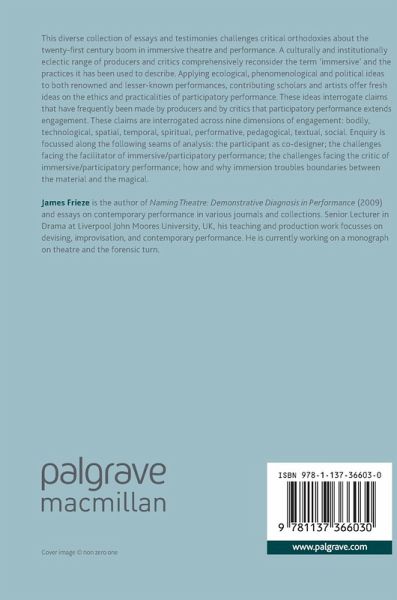 Introduction. Immersion Reconsidered; James Frieze.- Part I. Participant as Co-Designer.- Chapter 1. On Being Immersed; Josephine Machon.- Chapter 2. Insider Dynamics Transform Dance Spectatorship in Sleep No More; Julia M. Ritter.- Chapter 3. Troubling Bodies in Follow the North Star; Ruth Bowman.- Chapter 4. Experiencing Michael Mayhew's Away in a Manger; Roberta Mock.- Chapter 5. Integrating Realities through Immersive Gaming; Lindsay Brandon Hunter.- Chapter 6. Negotiating the Possible Worlds of Make Better Please; Elizabeth Swift.- Chapter 7. Outdoors; Esther Belvis Pons.- Chapter 8. Immersed in Sound; Kristian Derek Ball.- Part II. Facilitating Immersive Performance.- Chapter 9. reflections on immersion and interaction; non zero one.- Chapter 10. Caravania!; Adam J. Ledger.- Chapter 11. A Dramaturgy of Participation; Jorge Lopes Ramos and Persis Jade Maravala.- Chapter 12. She Wants You To Kiss Her; Richard Talbot.- Chapter 13. The Fourth Wall and Other Ruins; Rachel Blyth.- Chapter 14. Immersive Performance and the Marketplace; Sherrill Gow and Merryn Owen.- Part III. Where Material meets Magic.- Chapter 15. Spectral Illusions; Nele Wynants.- Chapter 16. Playing a Punchdrunk Game; Rosemary Klich.- Chapter 17. Proximity to Violence; James R. Ball III.- Chapter 18. The Promise of Experience; Adam Alston.- Chapter 19. Differences in Degree or Kind?; Geraldine Harris.- Chapter 20. Coriolan/us and the limits of 'immersive'; Andrew Filmer.- Chapter 21. Participation, Ecology, Cosmos; Carl Lavery.- Bibliography.