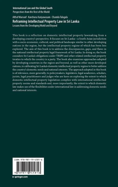 This book is a reflection on domestic intellectual property lawmaking from a developing country's perspective. It focuses on Sri Lanka-a South Asian jurisdiction with a socio-economic, cultural, and political landscape similar to other developing nations in the region, but the intellectual property regime of which has been less explored. The aim of this book is to address the discrepancies, gaps, and flaws in the national intellectual property legal framework of Sri Lanka. In doing so, the book considers Sri Lanka's obligations under TRIPS and other related intellectual property treaties to which the country is a party. The book also examines approaches adopted by developing countries in the region and beyond, as well as other more developed nations, in calibrating Sri Lanka's domestic intellectual property regime to better address the country's domestic needs and national interests. The approach adopted in this book is of relevance, more generally, to policymakers, legislators, legal academics, scholars, jurists, legal practitioners and judges who are keen on exploring the extent to which domestic intellectual property legislation complies with international intellectual property norms and standards and, more importantly, the extent to which domestic law makes use of the flexibilities under international law in addressing domestic needs and national interests.