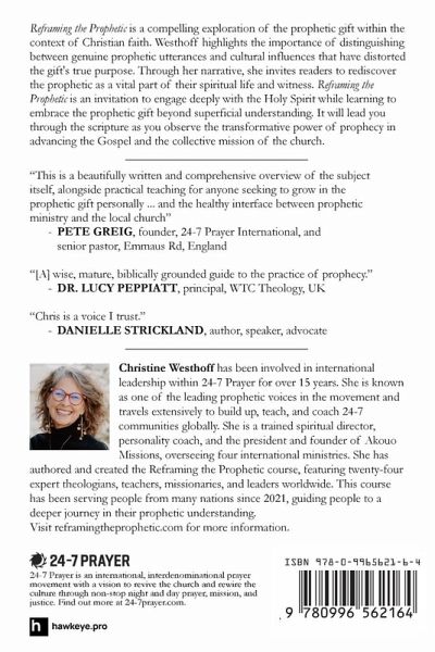 "This is a beautifully written and comprehensive overview of the subject itself, alongside practical teaching for anyone seeking to grow in the prophetic gift personally ... and the healthy interface between prophetic ministry and the local church"-Pete Greig, founder, 24-7 Prayer International, and senior pastor, Emmaus Rd, England "[A] wise, mature, biblically grounded guide to the practice of prophecy."-Dr Lucy Peppiatt, principal, WTC Theology, UK "Chris is a voice I trust."-Danielle Strickland, author, speaker, advocate Unlock the true power of the prophetic gift in today's world with "Reframing the Prophetic: A Biblical Observation of an Ancient Gift." This thought-provoking book offers a fresh perspective on the controversial and often misunderstood spiritual gift, addressing its role in modern society and the Church. With endorsements from renowned theological leaders, Christine Westhoff expertly dissects the biblical foundations of the prophetic, highlighting its potential for positive impact when properly discerned and applied. In an age where abuse of power and influence is prevalent, "Reframing the Prophetic" serves as a beacon of truth, inviting readers to reexamine their understanding of this ancient gift and its relevance today. Through a deep exploration of scripture and real-world examples, Westhoff teaches readers how to identify genuine prophetic utterances and use them to advance their faith, strengthen the Church, and ultimately honor God. Key Features:Expert analysis of the biblical roots and modern application of the prophetic gift Endorsements from leading voices in theology and ministry Practical guidance on discerning true prophetic utterances Inspiration to engage with the prophetic in a healthy, Christ-centered manner Don't let misconceptions or fear hold you back from embracing the power of the prophetic. Join author Christine Westhoff on a journey of discovery and transformation with "Reframing the Prophetic: A Biblical Observation of an Ancient Gift."