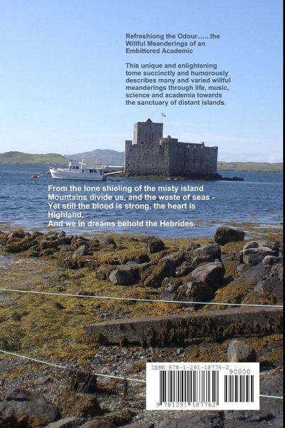 A richly humorous description of numerous and varied willful meanderings initiated within central England and terminating (often most) within Scotland's Outer Hebrides. The author's torturous academic development, grappling with scholastic inconsistencies and an aborted relocation to Manhattan, forms a vital backdrop to the philosophical content. An unbridled passion for both science and music intuitively shapes the narrative towards reflections of politics, religion, humanity, space travel, gametogenesis and the broader world beyond. Hence, amongst many scathing contemplations, celebrity culture is summarily dismissed as an abhorrent intrusion to modern life. This literary ouroborus will infuriate and bemuse, infuriate and bemuse......