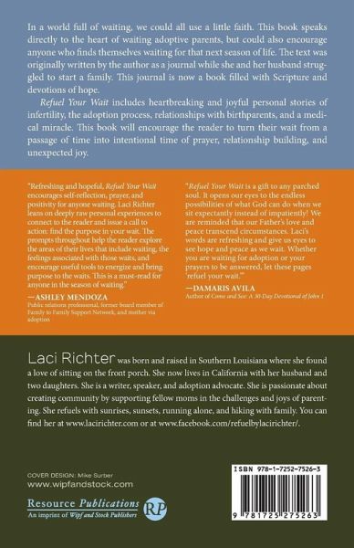 In a world full of waiting, we could all use a little faith. This book speaks directly to the heart of waiting adoptive parents, but could also encourage anyone who finds themselves waiting for that next season of life. The text was originally written by the author as a journal while she and her husband struggled to start a family. This journal is now a book filled with Scripture and devotions of hope. Refuel Your Wait includes heartbreaking and joyful personal stories of infertility, the adoption process, relationships with birthparents, and a medical miracle. This book will encourage the reader to turn their wait from a passage of time into intentional time of prayer, relationship building, and unexpected joy.