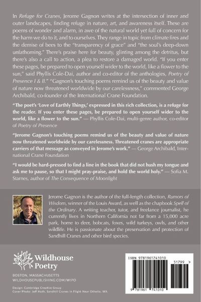 In Refuge for Cranes, Jerome Gagnon writes at the intersection of inner and outer landscapes, finding refuge in nature, art, and awareness itself. These are poems of wonder and alarm, in awe of the natural world yet full of concern for the harm we do to it, and to ourselves. They range in topic from climate fires and the demise of bees to the "transparency of grace" and "the soul's deep-down unfathoming." There's praise here for beauty, glinting among the detritus, but there's also a call to action, a plea to restore a damaged world. "If you enter these pages, be prepared to open yourself wider to the world, like a flower to the sun," said Phyllis Cole-Dai, author and co-editor of the anthologies, Poetry of Presence I & II." "Gagnon's touching poems remind us of the beauty and value of nature now threatened worldwide by our carelessness," commented George Archibald, co-founder of the International Crane Foundation.