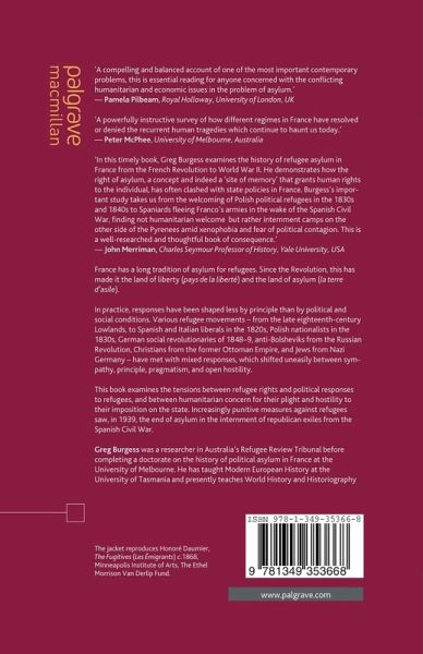 'In this timely book, Greg Burgess examines the history of refugee asylum in France from the French Revolution to World War II. He demonstrates how the right of asylum, a concept and indeed a 'site of memory' that grants human rights to the individual, has often clashed with state policies in France. Burgess's important study takes us from the welcoming of Polish political refugees in the 1830s and 1840s to Spaniards fleeing Franco's armies in the wake of the Spanish Civil War, findingnot humanitarian welcome but rather internment camps on the other side of the Pyrenees amid xenophobia and fear of political contagion. This is a well-researched and thoughtful book of consequence.' - John Merriman, Charles Seymour Professor of History, Yale University, USA